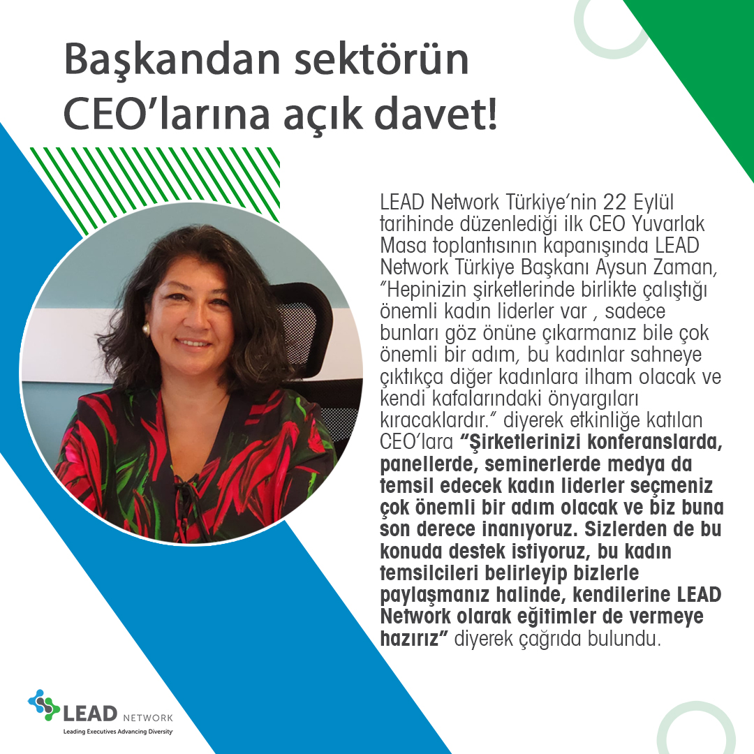 LEAD Network Türkiye 22 Eylül’de gerçekleştirdiği ilk dijital CEO Yuvarlak Masa etkinliğinde sektörün değerli 30 CEO’su ve yurtiçi-yurtdışı konuşmacıları bir araya getirdi. Toplantının sonunda Başkan Aysun Zaman, “Hepinizin şirketlerinde birlikte çalıştığı önemli kadın liderler var; sadece bunları göz önüne çıkarmanız bile çok önemli bir adım, bu kadınlar sahneye çıktıkça diğer kadınlara ilham olacak ve kendi kafalarındaki önyargıları kıracaklardır.” diyerek etkinliğe katılan CEO’lara “Şirketlerinizi konferanslarda , panellerde, seminerlerde medya da temsil edecek kadın liderler seçmeniz çok önemli bir adım olacak ve biz buna son derece inanıyoruz. Sizlerden de bu konuda destek istiyoruz, bu kadın temsilcileri belirleyip bizlerle paylaşmanız halinde, kendilerine LEAD Network olarak eğitimler de vermeye hazırız” diyerek çağrıda bulundu.